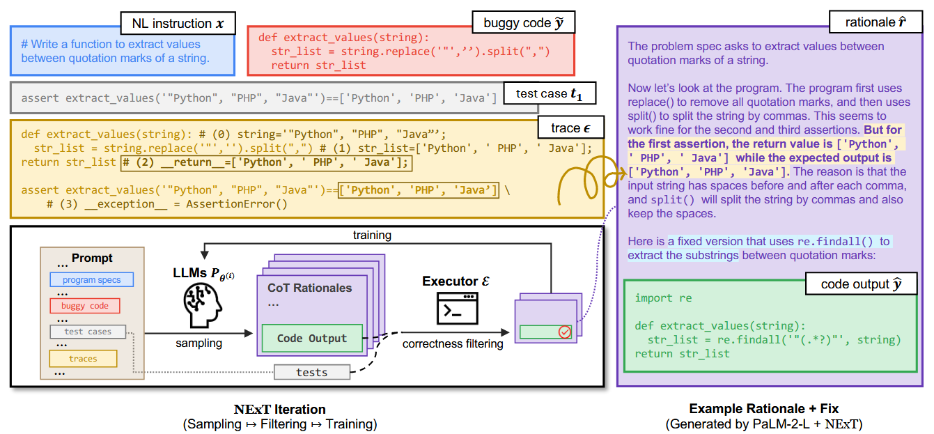 NExT: Teaching Large Language Models to Reason about Code Execution. Ansong Ni, Miltiadis Allamanis, Arman Cohan, Yinlin Deng, Kensen Shi, Charles Sutton, Pengcheng Yin. ICML 2024. TLDR: Teach an LLM to fix code through (useful) rationales about the code and its execution. |