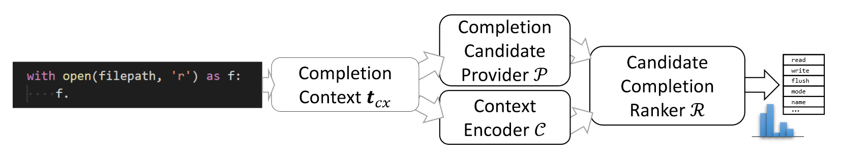 Fast and Memory-Efficient Neural Code Completion. A. Svyatkovskiy, S. Lee, A. Hadjitofi, M. Riechert, J. Franco, M. Allamanis. Mining Software Repositories 2021. TLDR: Lightweight yet accurate code completion use neural reranking models. |