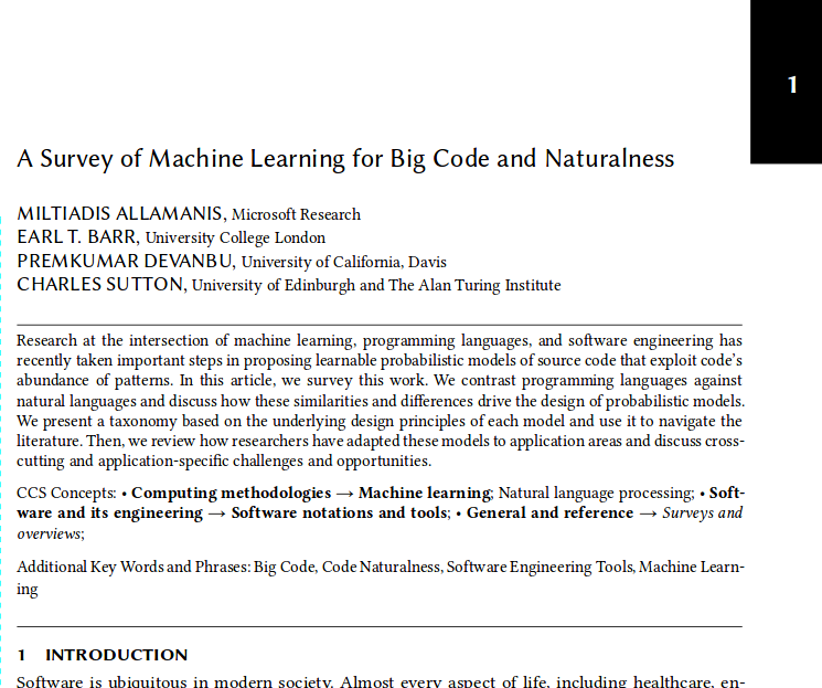 Research at the intersection of machine learning, programming languages, and software engineering has recently taken important steps in proposing learnable probabilistic models of source code that exploit code’s abundance of patterns. In this article, we survey this work. We contrast programming languages against natural languages and discuss how these similarities and differences drive the design of probabilistic models. We present a taxonomy based on the underlying design principles of each model and use it to navigate the literature. Then, we review how researchers have adapted these models to application areas and discuss cross-cutting and application-specific challenges and opportunities.